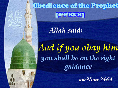 Allah Al-mighty says: [He who obeys the Messenger, has indeed obeyed Allah, but he who turns away, then we have not sent you as a watcher over them] An-Nisa’ 4:80. Here in this call Allah does not refer only to believers or to people in general, but he is referring to all creatures. Also, it is not confined to an exact era, i.e. it is a call that suits any age or era. Hence, it applies to all prophets, messengers and angels of all times and places. Moreover, such verse indicates many things: First, the great honor Allah bestowed upon the Prophet [PPBUH]; as it emphasizes the fact that Mohammad [PPBUH] can not but speaks of Allah’s will or command out of Allah’s own command [nor does he speak out of his own desire] An-Najm 53:3. Therefore, he is the only human void of committing any mistakes; as he says (All sons of Adam make sins, and the best of whom are those who repent). Second, this verse gives the Prophet the authority to command and the right to be obeyed as well. At the same time, it asserts the fact that he shall never do what may cause Allah’s dissatisfaction. It also indicates that Mohammad [PPBUH] is void of any misleading traits brought about by the effects of one’s self, subjectivity, the worldly life and Satan. A matter that reaffirms what was narrated by Aisha [AAH] when she asked the Prophet [PPBUH]: “haven’t you got any devil”. He replied saying: (Yes! But Allah gave me the strength to defeat it and make it a Muslim). Third, this verse shows how graceful is the prophet [PPBUH] and how near he is from Allah; as Allah has made his obedience [PPBUH] the gate to the obedience of Allah Amighty. That’s why Allah has made our obedience to the prophet linked all the way with our obedience to Allah. This is clearly shown in the verses referring to obedience: [Say: "Obey Allâh and the Messenger". But if they turn away, then Allâh does not like the disbelievers] Al-Umran 3:32. [O you who believe! Obey Allah and obey the Messenger, and those of you who are in authority. And if you differ in anything amongst yourselves, refer it to Allah and His Messenger] an-Nisa' 4:59. [O you who believe! Obey Allah and His Messenger, and turn not away from him while you are hearing] al-Anfal 8:20. [Say: "Obey Allâh and obey the Messenger, but if you turn away, he is only responsible for that with which he has been charged and you for that placed on you] al-Noor 24:54. [O you who believe! Obey Allah, and obey the Messenger and render not vain your deeds] Mohammad 47:33. [But if you obey Allah and His Messenger, He will not decrease anything in reward for your deeds] al-Hujraat 49:14. [And whosoever obeys Allah and His Messenger will be admitted to Gardens under which rivers flow] an-Nisa' 4:13. [Whoso obeys Allah and the Messenger, they are with those unto whom Allah has shown favour, of the prophets and the saints and the martyrs and the righteous. The best of company are they!] an-Nisa' 4:69. [He who obeys Allah and His messenger, and fears Allah, and and fears Him: such indeed are the victorious] al-Nour 24:52. [Whosoever obeys Allah and His messenger, he verily has gained a signal victory] al-Ahzab 33:71. [And whoso obeys Allah and His messenger, He will make him enter Gardens underneath which rivers flow; and whoso turneth back, him will He punish with a painful doom] al-Fath 48:17.