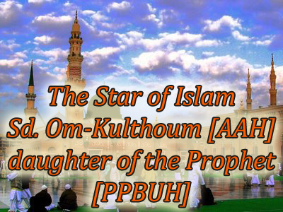 Her Birth [AAH]: Om-Kulthoum was born in Mecca before the Message of the Prophet [PPBUH]. She was raised on the virtues and the high moral standards. Her father is the Truthful, Honest, the Messenger of Allah [PPBUH] and her mother is the pure Khadija, the mother of believers [AAH] the best woman and the holder of the high rank and the great virtue. She was born after Sd. Roqaiya, and embraced Islam with her mother Khadija and her sisters. This is Sd. Om-Kulthoum whom is called by some preachers as: the star of Islam. Her Islam [AAH]: Om-Kulthoum [AAH] embraced Islam with the people of the house of the Prophet [PPBUH] with her mother Khadija [AAH] and all her sisters. Her Marriage [AAH]: When Om-Kulthoum [AAH] and her sister Roqaiya [AAH] were ready for marriage, Abo-Talib engaged them to the sons of his bother, Abdel-Ozza [Abo-Lahab]: Otba and Otiba. The Messenger of Allah [PPBUH] accepted because of how he respected Abo-Talib and because they were his cousins. Om-Kulthoum was engaged to Otiba. Her Divorce [AAH]: As soon as the Messenger of Allah [PPBUH] received the Message of his Lord, Almighty, and started calling for the true religion, Quraish started its war against him [PPBUH]. The masters of Quraish gathered and said: You have saved Muhammad the worries, so give him back his daughters to make him busy with them.
